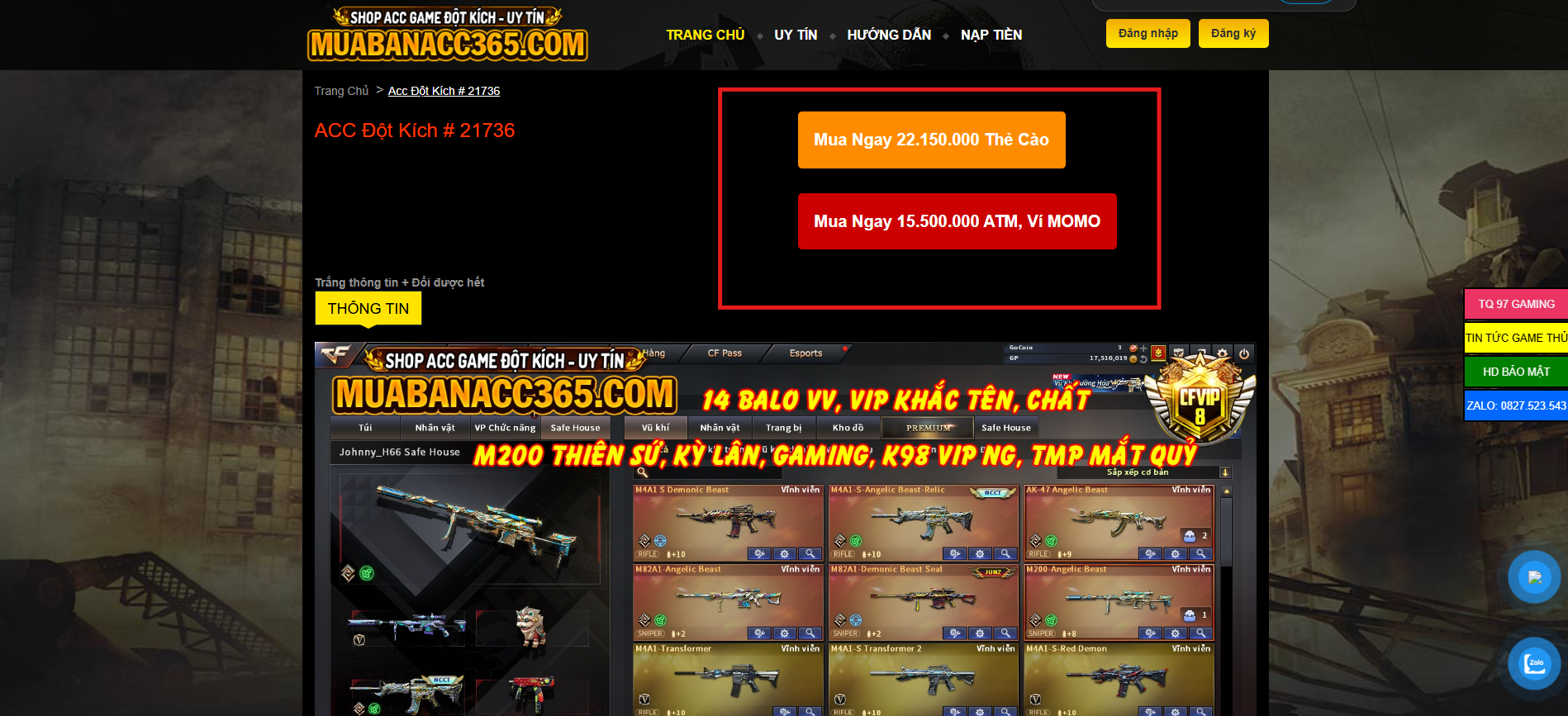 - Sau khi chọn acc xong, các bạn nhắn tin hoặc gọi tới số 0827.523.543 hỏi mình xem tài khoản đó còn không (cái này chỉ để xác nhận thôi vì acc nào bán rồi sẽ tự xóa ngay). Sau đó các bạn lấy số tài khoản ngân hàng hoặc ví Momo của mình trên Website và chuyển tiền vào, và ghi nội dung chuyển: Mua acc ??? (Ví dụ: Mua acc 123)