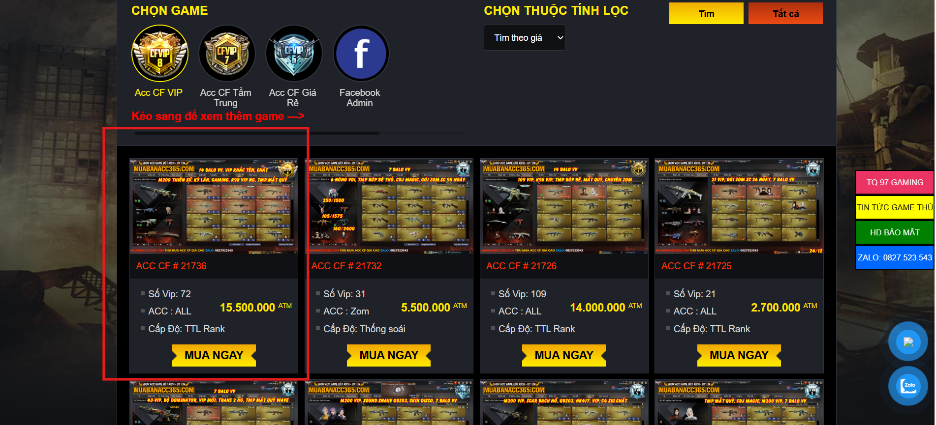 - Đầu tiên các bạn chọn Acc cần mua và xem số tiền phải thanh toán bằng thẻ cào của Acc đó